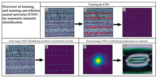 Basic outline of how the convolution neural network (CNN) was trained, and how it functioned in two stages to determine stomatal density. To train the CNN, first unmarked micrographs (a) were manually labelled, highlighting stomata in red (b) to indicate to the CNN what feature to search for. The output of the training was a label image generated by the CNN (c). The label image consisted of Gaussian peaks centered on stomata which enabled the network to extract relevant 2D features for the following two stages. Once the CNN was trained, the first stage CNN scanned an unmarked epidermal micrograph (d) for possible stomatal complexes and output a heatmap of potential locations (e). The second stage CNN was centered on windows around each heatmap reaction point from the previous CNN (f) and determined if the visual object is a stomatal complex or not (g).