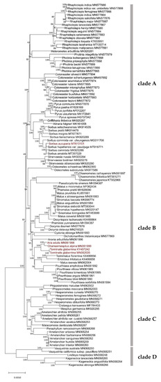 Four well-supported clades (A–D) could be resolved in the phylogenetic tree of the Maleae tribe (Figure 2). Clade A included Rhaphiolepis, Heteromeles, Photinia, Cotoneaster, Pyrus, Griffitharia, Alinaria, Sorbus and Stranvaesia. The most diverse clade B included Osteomeles, Pourthiaea, Malus, Tormimalus, Eriolobus, Aria, Chamaemespilus, Torminalis, Aronia, Cydonia, Dichothomanthes, Chaenomeles, Pseudocydonia, Docynia, Prameles, Sinomalus and Phippsiomeles. Clade C involved Hesperomeles, Crataegus, Mespilus, Amelanchier, Malacomeles and Peraphyllum. Finally, the most divergent clade D included Vaquelinia, Lindleya and Kageneckia (Figure 2).