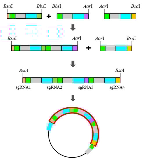 Several methods for constructing multiple sgRNA vectors have been reported to simultaneously knock out multiple genes [2]. The Golden Gate assembly is a common approach for constructing a multi-sgRNA vector [3,4,5]. The procedure starts with generating insert fragments that are ligated into the subcloning vector. The insert can be generated by the template vector PCR or oligonucleotide annealing. The next step is subcloning, which makes sgRNA fragments available for Golden Gate assembly. Finally, after the DNA sequence verification of the subcloning vector, the Cas9 vector and subcloned vectors are mixed in one pot for the Golden Gate assembly. However, the above-mentioned methods require a special pair of subcloning and CRISPR/Cas9 vectors for Golden Gate assembly. Therefore, a more ubiquitous method is required for cloning multiple sgRNAs using type IIS restriction enzymes, especially in laboratories that only have a general CRISPR/Cas9 vector.