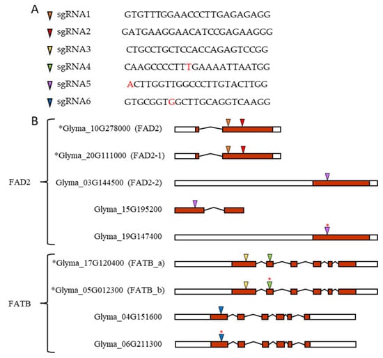 FAD2 and FATB candidate genes in soybean and its sgRNA sequence and target location. (A) sgRNAs and their sequence. (B) Based on transcript form, left white box for 5′ end UTR, right white box for 3′ end UTR, red box for exon, angled line for intron splicing, and colored triangle for sgRNA target sites. Black asterisk in front of gene accession number indicates major expressing genes. Red asterisk on colored triangle indicates one base pair mismatch between gDNA sequence and sgRNA sequence. This mismatch is also indicated in red letters in the sgRNA4, sgRNA5, and sgRNA6 sequences in Figure 7A.
