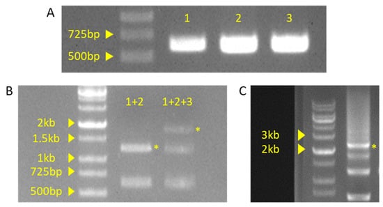 Gel picture of PCR or ligation products. (A) PCR product of insert fragment. Each fragment numbers indicate sequential order. 1: DT1 and DT2 primer set used fragment, 2: DT3 primer set used fragment, 3: DT4 primer set used fragment. (B) Product of Golden Gate reaction. +indicate ligation of insert fragment. (C) Product of pHEE401E vector colony PCR. Yellow asterisk indicated by the expected band is the expected result.