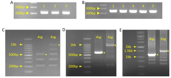 After the verification of the expected band size of the pBAtC_4sg insert and pBAtC_6sg insert (~550 bp and ~1 kb, respectively), PCR was performed under the conditions listed in Table 10. Finally, 3 μL of PCR products was examined using gel electrophoresis (Figure 8D).
