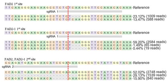 To verify the indel position and indel type percentage of each vector transformant, the FASTQ result files were investigated using the CRISPResso2 web tool [16]. However, the tool considers homologous genes such as FAD2 and FAD2-1 as base pair replacement mutations; therefore, the total indel ratio of each target site shows a different value from the CRISP.py (Table 18, Tables S1–S3). That is, CRISPResso2 only counts perfect matching reference sequences as indels. For example, in the case of the pHEE401E_4sg-10 transformant, the indel ratio in the FAD2 first target site using CRIS.py has a higher indel ratio value of 66.4% (Table 18), while the indel ratio with CRISPResso2 has a lower value of 23.12% (Figure 9). In addition, through the CRISPResso2 analysis, 29.13% of large deletions between the sgRNA1 and sgRNA2 target sites were confirmed at the second target sites of FAD2 and FAD2-1 (Figure 9). In this study, various indels in the T0 generation were identified. Such complex indels are expected to be fixed with one major indel per individual line as the generation progresses.