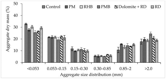 Aggregate stability index (SI) was obtained by determining the MWD of air-dried soils and soils sieved after being dispersed in water on a planetary shaker [] following Equation (4).