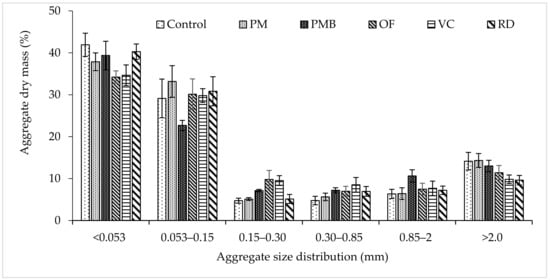 Distribution of different aggregate size fractions within 0–15 cm soil layer under different treatments in charland soil (bars = average and line = standard error of mean, SEM; n = 10). (PM = poultry manure, PMB = poultry manure biochar, OF = compost, VC = vermicompost, RD = recommended dose from only chemical fertilizer).