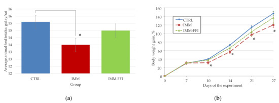 Integral indicators of rats during experiment No.1: (a) average animal feed intake, g/day/rat; (b) rats weight gain, %. *—Difference with the control group is significant, p < 0.05.