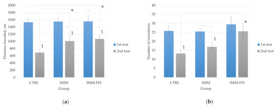 Figure 2 shows comparative results of the EPM testing of animals at the beginning of the experiment and after 24 days of feeding with experimental diets. At the 25th day of the experiment, the behavior of the animals changed: the indicator of the distance traveled differed significantly for all groups compared to the first test (p < 0.05, Mann–Whitney test). Animals of the IMM and IMM-FFI groups exposed to daily immobilization moved significantly more through the maze during the second test. This is expressed in a significantly greater (p < 0.05, Mann–Whitney test) distance traveled compared to the animals of the control group (Figure 2a). In the IMM-FFI group, animals performed significantly (p < 0.05, Mann–Whitney test) more transitions between arms compared to the control group (Figure 2b). Greater locomotor activity of animals was apparently associated with daily immobilization. The animals of the IMM-FFI experimental group spent significantly less time in the closed arms of the maze compared to the first test (p < 0.05, Mann–Whitney test). They also spent significantly less time in closed arms (Figure 2c) in the second test and, accordingly, spent more time in open arms compared to the animals of the IMM control group (Figure 2d).