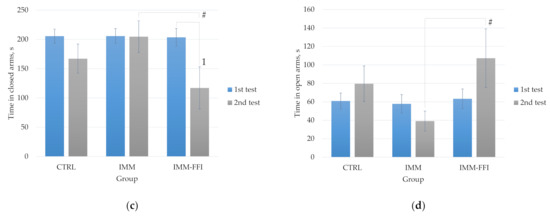 EPM testing results: (a) distance traveled in the maze, cm; (b) a number of transitions between maze arms; (c) time in closed arms, s; (d) time in open arms, s. First test before feeding by experimental rations. Second test on the 25th day of the experiment. 1—Differences are significant (p < 0.05) compared to 1st test. *—Differences are significant compared to the CTRL group, p < 0.05. #—Differences are significant (p < 0.05) compared to the IMM group, p < 0.05.