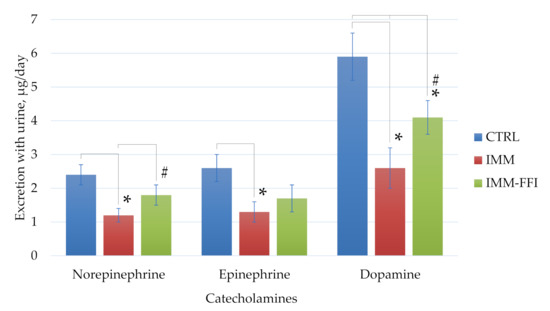 Daily urinary catecholamine excretion, µg/day. *—Differences are significant compared to the CTRL group, p < 0.05. #—Differences are significant compared to the IMM group, p < 0.05.