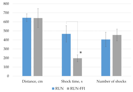 Figure 4 shows the results obtained during the exhausting physical exercise test on a treadmill. At the end of testing, there were no significant differences in indicators such as distance traveled and number of electric shocks received between the compared groups. However, a significant increase in shock time, by more than two times, was found in animals of the RUN control group, compared with animals receiving FFI (p < 0.05, Mann–Whitney test). Thus, the consumption of FFI contributed to the improvement of physical performance and reaction rate in animals under simulated conditions.