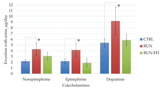 Daily urinary catecholamine excretion, µg/day. *—Differences are significant compared to the CTRL group, p < 0.05.