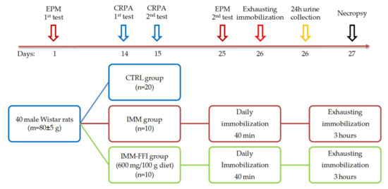 On the 26th day of the experiment, the animals of the IMM and IMM-FFI groups were subjected to exhausting immobilization for 3 h. Immediately after exhausting immobilization, the animals were placed for 24 h in metabolic cages to collect daily urine. On day 27, fasted rats were removed from the experiment by decapitation under light ether anesthesia. The blood of the animals was collected on an anticoagulant and centrifuged for 15 min at 4000 rpm. The rats’ plasma was stored at −80 °C. Catecholamine content in the urine was analyzed, as were the blood-indices of protein, lipid, and mineral metabolism and indices of the functional state of the liver. The design scheme and timeline are shown in Figure 7.
