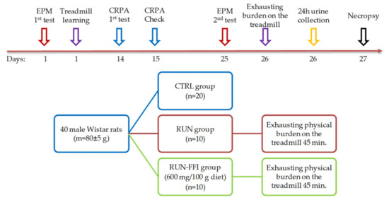 Sixty male Wistar rats (at the age of four weeks) with an initial body weight of 80 ± 5 g were taken before the experiment. As in experiment No. 1, before the study animals were divided by their behavioral phenotype in the EPM test after quarantine. According to [43], when the treadmill test (Treadmill, PanLab, Barcelona, Spain) is used in the model, it is recommended to train experimental animals at low speeds, inclinations, and durations to avoid unintentional injury. The duration of the training was 10 min; belt speed was gradually increased from 15 cm/s to 18 cm/s with a treadmill incline of 0°. Further, according to [44], the learning ability of the animals was evaluated. Rats not capable of running were excluded from the experiment. Afterwards, 40 animals were randomly divided into three groups according to their body weight, EPM test results, and treadmill training: CTRL (n = 20), RUN (n = 10), and RUN-FFI (n = 10). Animals of groups CTRL and RUN received a standard semi-synthetic diet for 26 days of the experiment. Rats of the RUN-FFI group received a modified semi-synthetic diet supplemented with FFI in amount 600 mg per 100 g. The animals received food and water ad libitum. Feed intake was assessed every other day. The body weight of the animals was recorded on days 5, 7, 12, 18, and 25. Assessment of the behavior and short-term memory of animals was carried out on the 15th day of the experiment using the CRPA test. On the 26th day of the experiment, the CTRL, RUN and RUN-FFI animals were all subjected to the exhausting physical burden test on the treadmill; over a 45 min duration, belt speed was gradually increased from 26 cm/s to 40 cm/s, and treadmill incline was 10°. Immediately after running, the animals were placed in metabolic cages for 24 h to collect daily urine in order to study catecholamine excretion levels. On day 27, fasted rats were removed from the experiment by decapitation under mild ether anesthesia; blood was collected to study biochemical parameters. The design scheme and timeline are shown in Figure 8.