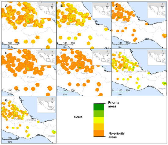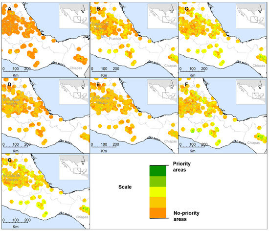 Priority area scenarios for the in situ conservation of cultivated hawthorn (C. mexicana), based on seven different criteria-map combinations. (A) S1—All criteria with the same weight. (B) S2—All criteria with weights assigned by experts. (C) S3—All criteria with weights assigned by AHP. (D) S4—HIC-EXP with the same weight. (E) S5—HIC-EXP with weights assigned by experts. (F) E6—HIC-AHP with the same weight. (G) S7—HIC-AHP with weights assigned by AHP.