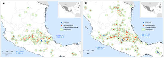 A spatial multi-criteria analysis (sMCA) was carried out for (1) C. mexicana as a cultivated species, documented in crops in Mexico, specifically in Puebla (hereinafter referred to as “cultivated”), and (2) other species of the genus Crataegus L., except C. mexicana, that grow under natural conditions and are whose fruits are harvested (hereinafter referred to as “wild”). The study area was defined based on the occurrence data from herbaria, Global Biodiversity Information Facility (GBIF) records [68], and collection sites with a buffer area of 20 km from each point of occurrence. The resulting working area was 10,955 cells with a resolution of 2.5 arc-min (5 km × 5 km at the equator) in the case of wild species, whereas for cultivated species it was 6007 cells. These cells represent 13% and 8% of the national territory, respectively (Figure 3).