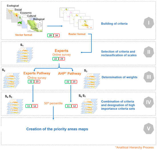 Process for the identification of priority areas for the in situ conservation of wild hawthorn (Crataegus spp.) and cultivated hawthorn (C. mexicana) in Mexico. The green and red boxes indicate the number of criteria considered for both wild and cultivated hawthorn at each stage of the process, respectively. S1, S2, S3, S4, S5, S6, and S7 represent the comparison scenarios.