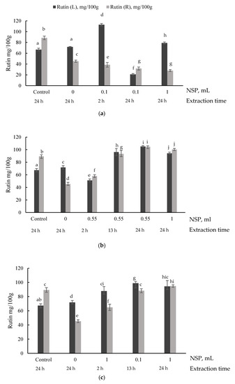 Rutin determination in different samples after optimization runs at: 60 °C temperature (a), 70 °C temperature (b), and 80 °C temperature (c). Where rutin (L) mg/100 g—rutin content in liquid phase, rutin (R) mg/100 g—rutin content in residues. X abscissa indicates a non-starch polysaccharides enzyme cocktail in the mixture and extraction time of each sample; 0 sample is with amylolytic enzymes without NSP and the control sample without enzymes after water extraction at room temperature; a–i letters for the same analytical parameter, above the columns, show a significant difference between the samples at the same temperature (p > 0.05).