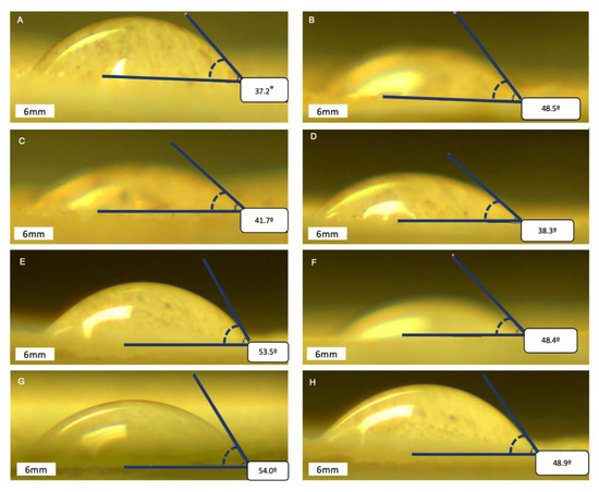 Water contact angle images in different samples after optimization runs, where A—control sample solid fraction; B—control sample water fraction; C—1 sample solid fraction; D—1 sample water fraction; E—2 sample solid fraction; F—2 sample water fraction; G—3 sample solid fraction; H—3 sample water fraction.