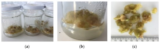 The soybeans were washed for 10 min under running water and then for another 10 min in sterile distilled water with a drop of Tween. They were then rinsed in sterile distilled water until Tween residues were removed and sterilized in a 20% ACE solution (5% active chlorine) for 20 min. The sterilized soybeans were kept for six hours in sterilized deionized water. For the initiation of in vitro callus culture was used only the part of the cotyledon that contained the hypocotyl. They were placed in test tubes, on the culture medium Murashige and Skoog (1962) [48] (MS) supplemented with 30 g sugar (Coronița AGRANA Romania), 0.1 mg/L 6-benzylaminopurine (BAP) + 0.1 mg/L thidiazuron (TDZ), and gelled with 5 g/L plant agar. All the materials were obtained from Duchefa, (Haarlem, The Netherlands).