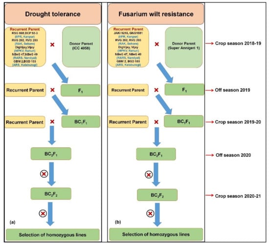 F1s were harvested at each center by crossing chosen recipient parents with ICC 4958 as a donor (“QTL-hotspot”) for drought tolerance and with Super Annigeri 1 as a donor for FW resistance during 2018–2019. True hybrids were confirmed using 10 SNP panel and two allele specific markers for the respective traits (Table 1 and Table S1 in Supplementary Materials). Subsequently, BC1F1 were obtained by crossing true F1s to their respective recurrent parents during 2019–2020. At all centers, heterozygous plants were used for subsequent backcrossing with respective recurrent parents, and BC2F1 seeds were harvested during the off season 2020. After foreground selection, positive BC2F1 plants were selfed to generate BC2F2 seeds during crop season 2020–2021 (Table S2). The back cross progenies after background selection needs further evaluation for their yield performance under drought.