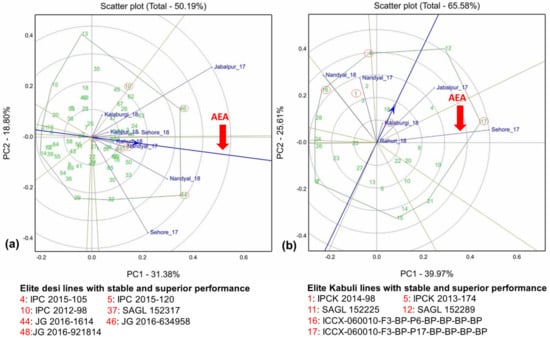 GGE biplots of (a) 70 desi elite lines evaluated in five locations and (b) 30 kabuli elite breeding lines evaluated in three locations for yield (kg/ha) during crop seasons 2016–2017 and 2018–2019. The Average Environment Axis (AEA) or Average Environment Coordination (AEC) abscissa (in blue) is the single arrowed line, which passes through the origin of the biplot and through the hypothetical average environment, denoted by the circle near (Rahuri_18 and Nandyal_17 (Desi line biplot) and Kalaburgi_18 (Kabuli lines biplot). The direction of the arrowhead on the AEA points to higher mean values for grain yield. PC1 and PC2 are the first and second principal components, respectively. Desi and kabuli lines with stable yield performance are circled in red and their genotype names are indicated below the GGE plots.