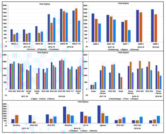 In Uttar Pradesh, during the 2017–2018 FPVS trials, variety RVG 202 showed highest grain yield in Fatehpur district and variety Shubhra was found higher yielding in Jalaun district (Table 5 and Figure 4e). While Shubhra and Ujjawal gave higher yields compared to RVG 202 in Fatehpur and Jalaun districts in 2018–2019 trials (Table 5 and Figure 4e), Shubhra recorded the highest yield in Mahoba district. In the 2019–2020 FPVS trials, RVG 202 recorded the highest grain yield in Fatehpur and Jalaun districts (Table 5) while JG 14 recorded highest grain yield of 1548 kg/ha (Table 5) in Mahoba district. RVG 202 was preferred as the best performing line by farmers in the state.