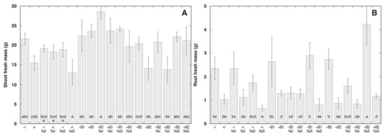 Fresh mass of shoots (A) and fresh mass of roots (B) of Anthyllis maritima plants after seven weeks of cultivation in the respective combination of conditions. –i, no rhizobial inoculant; +i, with rhizobial inoculant; NaI, irrigated with 25 mM NaCl; NaS, sprayed with 100 mM NaCl; B1, buried with sand by 2 cm; B2, buried with sand by 4 cm. Different letters indicate significant differences (p < 0.05) between treatments.