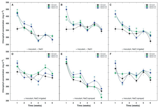Sand burial effect on time course of chlorophyll concentration in leaves of Anthyllis maritima without rhizobial inoculant and without NaCl treatment (A), with rhizobial inoculant and without NaCl treatment (B), without rhizobial inoculant and with NaCl treatment in a form of substrate irrigation (C), with rhizobial inoculant and with NaCl treatment in a form of substrate irrigation (D), without rhizobial inoculant and with NaCl treatment in a form of foliage spray (E), with rhizobial inoculant and with NaCl treatment in a form of foliage spray (F). Each data point represents the mean from four randomly selected containers per treatment with three measurements per container ± SE. * indicates statistically significant differences from respective unburied plants (p < 0.05).