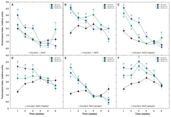 Results of ANOVA showed that leaf chlorophyll concentration and performance index were highly significantly affected by burial, inoculant and time, but not by NaCl (Table 4). Both parameters were significantly affected by two-way interactions between burial and NaCl, NaCl and time, burial and time, and inoculant and time, but performance index was also significantly affected by interaction between inoculant and NaCl. In addition, performance index was also significantly affected by a three-way interaction between burial, inoculant and time.