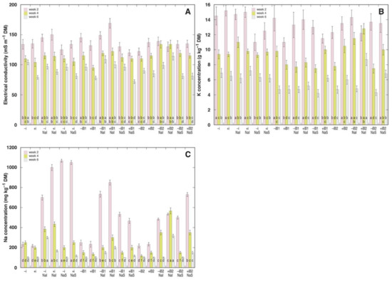On week 2, 4 and 6, one fully grown leaf per plant was collected for measurement of tissue ion concentration [27]. Plant material from each two plants was pooled, and three replicates per treatment were analyzed. Leaves were dried at 60 °C in an oven until a constant mass, crushed by hand to small pieces, and a sample of 0.2 g was randomly taken from the total amount of leaf material. Tissues were ground with mortar and pestle to a fine powder and 10 mL of deionized water was added. The homogenate was stirred with pestle for 1 min. After filtration through nylon mesh cloth (No. 80), homogenate was used for measurement of ion concentration by LAQUAtwin compact meters B-722 (Na+) and B-731 (K+), and electrical conductivity (EC) by LAQUAtwin conductivity meter B-771 (Horiba, Kyoto, Japan).