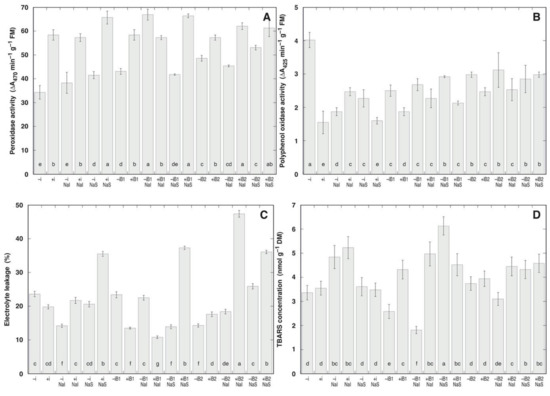 Both the indirect indicator of membrane damage, i.e., rate of electrolyte leakage from tissues (Figure 6C), as well as the biochemical indicator of lipid peroxidation, TBARS concentration (Figure 6D), significantly varied between treatments. There was no tight correlation between the two parameters and none of them were significantly affected by any of the factors, according to the ANOVA analysis (data not shown). However, there was significant effect of experimental factors in several treatment combinations.
