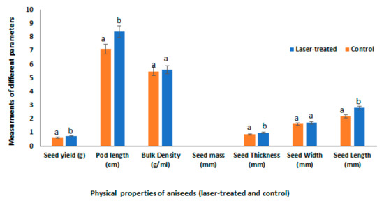 Supporting such a hypothesis, the current results have shown significant increases in length, width, thickness, pod length, and yield of laser-treated anise fruits, when compared to their respective controls (Figure 1). Meanwhile, fruit mass was not affected by laser treatment. In agreement, previous studies have demonstrated the enhancing effects of laser on growth and biomass production in many plant species, such as anise, cumin, fennel, coriander, white lupine, faba bean, lemongrass sprouts, and buckwheat sprouts [4,8,9,10,11,19]. Thus, laser light might affect plant growth, either directly through activating germination and thermodynamic parameters, or indirectly by its positive impact on the photosynthetic activity.