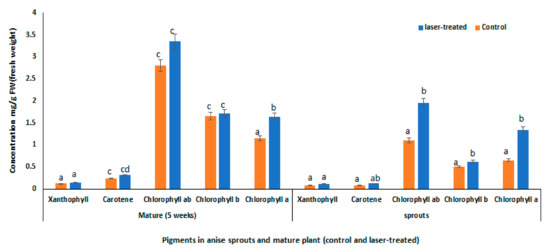 Pigments in sprouts and mature anise (control and laser light-treated). Data are represented by the means of at least 3 replicates ± standard error. Different small letters (a, b, c and d) above columns indicate significant differences between control and laser-treated samples at p < 0.05.