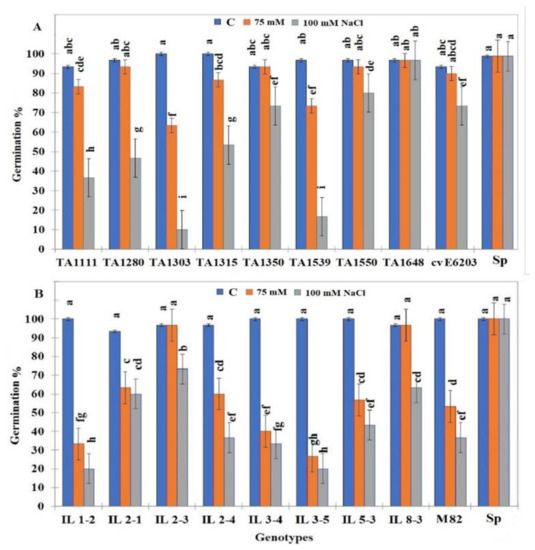 The percentage of germination of tomato ILs seeds under control (0 mM NaCl) and salt stress conditions (75 mM and 100 mM NaCl). (A) ILs from group I (S. lycopersicum cv-6203 × S. habrochaites). (B) ILs from group II (S. lycopersicum cv-M-82 × S. pennellii). Data are means of three replicates ± standard deviation; different letters on bars represent significant values according to Duncan’s test (p < 0.05).