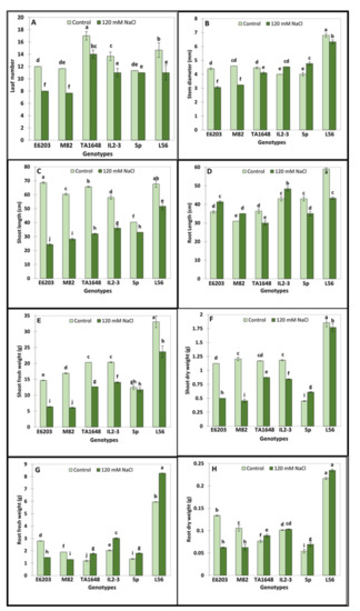 Salt tolerance evaluation under a hydroponic system of two ILs TA1648 and IL2-3 in comparison to two salt-sensitive cultivated tomato varieties “E6203, and M82” and two salt-tolerant reference genotypes, “LA0716” (wild type: SP) and “L56” (fixed variety). Two treatments control and 120 mM NaCl, were used. (A) Leaf number (LN), (B) stem diameter (SD), (C) shoot length (SL), (D) root length (RL), (E) shoot fresh weight (SFW), (F) shoot dry weight (SDW), (G) root fresh weight (RFW), and (H) root dry weight (RDW). Data are the means of three replicates ± standard deviation; different letters on bars represent the significant values according to Duncan’s test (p < 0.05).