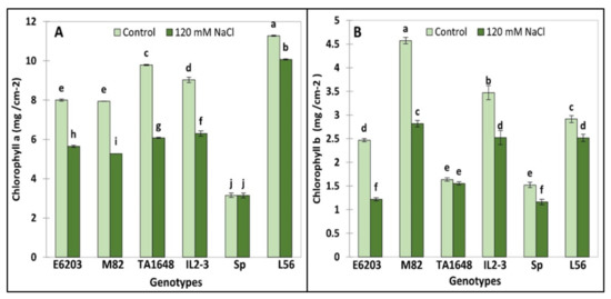 Chlorophyll a (Chl.a) and chlorophyll b (Chl.b) were analyzed in young leaves to evaluate salt tolerance of ILs. The Chl. a and Chl. b concentration significantly decreased under salt stress (120 mM NaCl) in all evaluated tomato ILs and salt-tolerant check variety L56 (Figure 4A,B). However, Chl.a in SP and Chl.b in TA1648 were not affected following salt stress (Figure 4). The lowest Chl.a reduction by about 10% was recorded in the tolerant cultivated tomato L56 followed by 30% in E6203 and IL2-3 (Figure 4A). However, for Chl.b the lowest decrease is about 5% in the IL TA1648 followed by 14% in the tolerant variety L56 (Figure 4B).