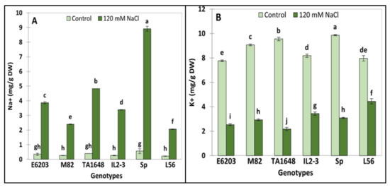 Under stress conditions, the highest K+ accumulation was observed in the tolerant check variety L56 (4.4 mg/g DW) followed by IL2-3 (3.4 mg/g DW), SP, M82, and finally by TA1648 and E6203 (Figure 5B). Based on the fact that Na+ affects K+ homeostasis involved in numerous metabolic processes, maintaining the equilibrated cytosolic Na+/K+ ratio is a key salinity tolerance mechanism. The highest Na+/K+ ratio was observed in the salt-tolerant wild-type genotype SP. (Na+/K+ = 2.9), while the lowest ratio was registered in the tolerant check variety L56 (Na+/K+ = 0.47). Finally, the ILs IL2-3 and TA1648 have Na+/K+ ratios of 1 and 2, respectively.