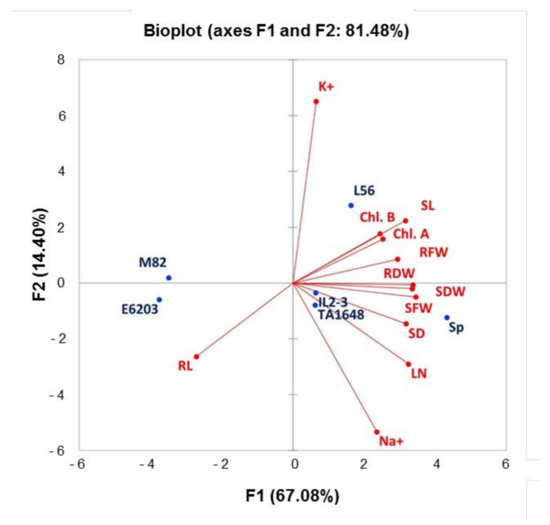 Principal Component Analysis (PCA) was conducted for average values of salt tolerance indices (S/C) for all measured traits to determine the main growth parameters that could be estimated to evaluate and select the salt-tolerant tomato ILs (Figure 6). The first three principal components explained 92.63% of the phenotypic variation and covered all measured traits (Table S2). The first two principal components (PC1 and PC2) had Eigenvalue greater than 1.7 and explained 67.08% and 14.4% of the total variance, respectively. Ten growth traits with a score of >0.48 positively loaded in PC1 included measured traits, LN, SL, SFW, SDW, SD, RL RFW, RDW, Chla, and Chlb. While PC2 contained ions content parameters (Na+, and K+) with a high score >0.48 (Table S2). Indeed, SFW, SDW, and RDW under salt stress demonstrated the highest values in PCA1 which were significantly correlated in salt-tolerant genotypes (SP and L56). PCA1 had a positive correlation with all measured traits, except for one trait, RL which demonstrated a negative correlation with all other traits (Figure 6, Table S3). The Eigenvector’s distance and direction characterized the relationships between traits and genotypes. The scattering of tomato genotypes in the same direction helped group them with similar physiology traits associated with salt tolerance. PCA substantially demonstrated that RL has a stronger correlation with the salt-sensitive genotypes (E6203 and M82). Under salt stress 120 mM NaCl, the salt-tolerant genotype L56 moved towards a chlorophyll concentration, K+ concentration, SL, and RFW. The introgression lines, TA1648 and IL2-3 as well as wild SP (relative parent of IL2-3), were shifted toward the morphological traits, SFW, SDW, RDW, SD, LN, and Na+ concentration.