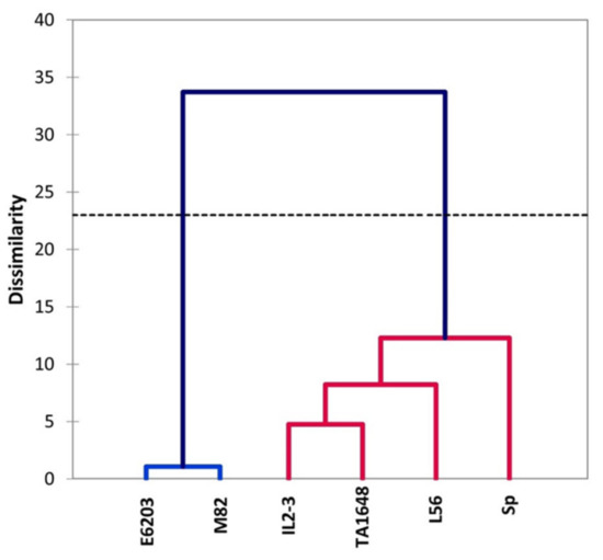 Hierarchical cluster analysis of two ILs (TA1648 and IL2-3), the cultivar parents (cv. E6203 and M82) and two salt-tolerant reference genotypes, “SP” (wild type) and “L56” (fixed variety) for salt tolerance indices based on physiological parameters analysis at the vegetative stage grown under control and salt stress condition (120 mM). The dendrography was drawn by Ward’s method in XLSTAT software.