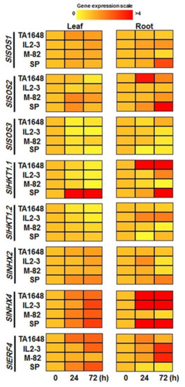 Heat map showing the expression level of eight salt stress-related genes throughout the leaf and root of tomato ILs and their relative parents in response to 120 mM NaCl treatment after 24 and 72 h. Data from qRT-PCR experiments were analyzed according to the 2−∆∆Ct method. The housekeeping actin gene was used as an internal reference control to normalize the expression levels of the target genes. Values are mean ± SD. (n = 3) at p < 0.05.