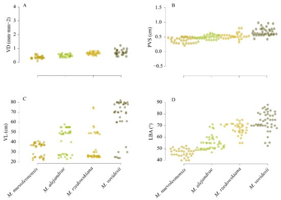 Even though there were no statistically significant differences, the Spearman test showed the minimum and maximum values among Magnolia leaf traits. Magnolia nuevoleonensis showed the lowest VD values (from 0.25 to 0.59 mm·mm−2) related to M. alejandrae and M. rzedowskiana. Notwithstanding, M. vovidesii had higher VD values (0.43 to 0.99) than the other Magnolia species, (Figure 4A). We found that PVS values ranged from 0.28 to 0.81 cm, where M. nuevoleonensis showed the lowest PVS values (from 0.28 to 0.5) and M. vovidesii the highest values (from 0.55 to 0.81), Figure 4B. Vein length (VL) showed significant differences among Magnolia species: M. nuevoleonensis showed the lowest VL values (from 22 to 41), while M. alejandrae and M. rzedowskiana observed similar VL values (from 25 to 55) and M. vovidesii showed higher VL values (from 24 to 80), Figure 4C. The lowest LBA values were detected in M. nuevoleonensis (from 40 to 50°), and M. alejandrae and M. rzedowskiana showed middle LBA values (from 48 to 75). Lastly, M. vovidesii showed the highest LBA values (from 55 to 88), Figure 4D.