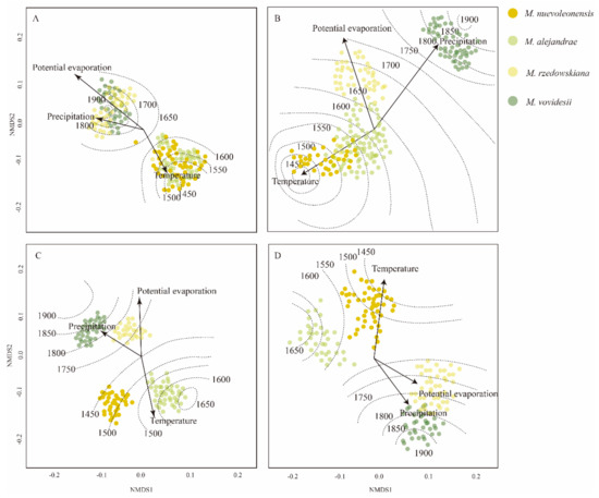 The VL is influenced by specific climatic variations in which each of the Magnolia species is distributed. For example, the VL values of M. nuevoleonensis and M. alejandrae are affected by high temperatures, while M. rzedowskiana and M. vovidesii are influenced by high precipitations and potential evaporation rates (Figure 5C; Stress index: 0.077; GCV score: 0.047).
