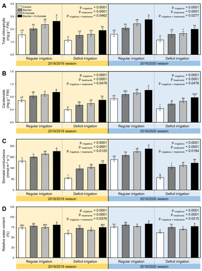 2.3. Exogenous Application of Biochar and K-Humate Enhanced Water Relations of Deficiently Irrigated Onion Plants