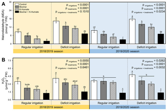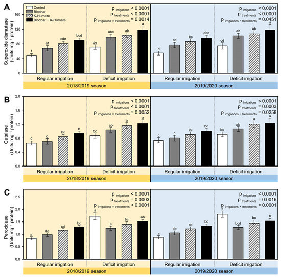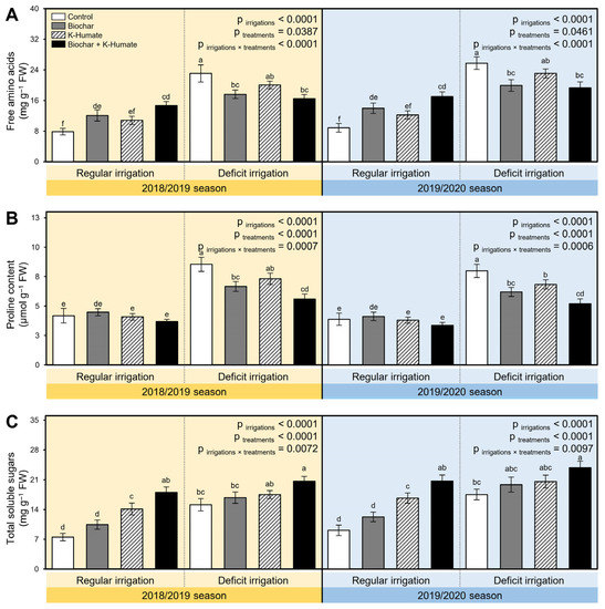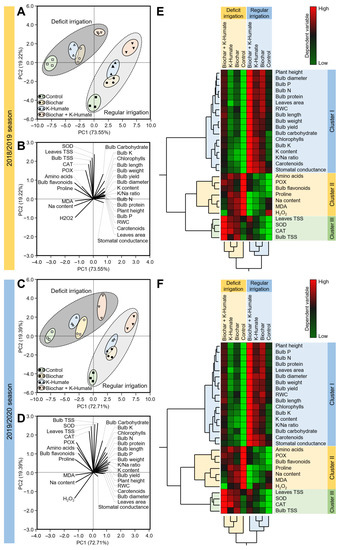 2.4. Soil Amendment Using Biochar and K-Humate Foliar Application Improved the Biochemical Response of Deficiently Irrigated Onion Plants