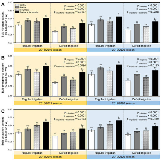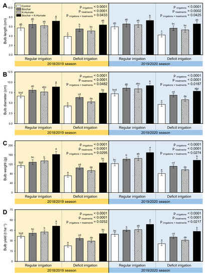 Abdelrasheed, K.G.; Mazrou, Y.; Omara, A.E.-D.; Osman, H.S.; Nehela, Y.; Hafez, E.M.; Rady, A.M.S.; El-Moneim, D.A.; Alowaiesh, B.F.; Gowayed, S.M. Soil Amendment Using Biochar and Application of K-Humate Enhance the Growth, Productivity, and Nutritional Value of Onion (Allium cepa L.) under Deficit Irrigation Conditions. Plants 2021, 10, 2598. https://doi.org/10.3390/plants10122598