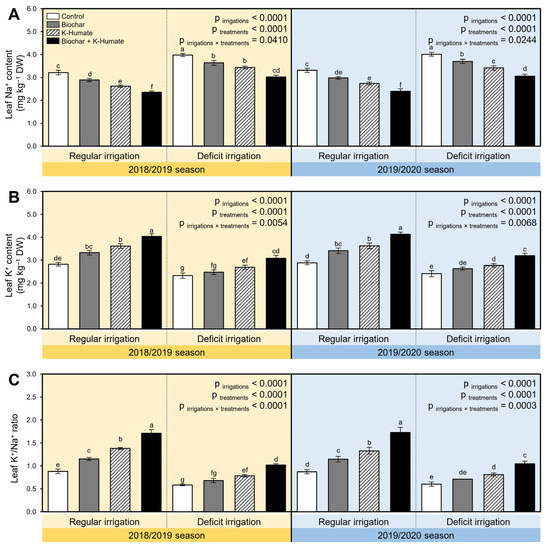 2.10. Combined Biochar and K-Humate Application Reduced the Na+ Accumulation in Onion Leaves under Deficient Irrigation Conditions