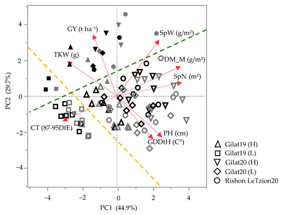 Principal component analysis of agronomic traits under five environments across two seasons, 2018–2019 and 2019–2020. Modern bread wheat cultivars (solid gray symbols), modern durum cultivars (solid black symbols), bread wheat landraces (hollow gray symbols), and durum wheat landraces (hollow black symbols). Biplot vectors are trait factors loading for PC1 and PC2. GY, grain yield; SpW, spike weight; DM_M, dry matter at maturity; SpN, spike number; PH, plant height; GDDtH, growing degree days to heading; CT, canopy temperature; and TKW, thousand kernel weight. Green dashed line separates the modern cultivars from the landraces (with two exceptions). Yellow dashed line separates Gilat19 (L) from the rest of the environments.