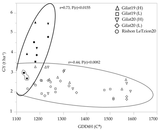 Modern durum cultivars maintained higher yield compared to durum landraces in all the environments except for one outlier, cv. Solet, exhibiting low GY in the two most extreme environments [Gilat19 (L) and Rishon LeZion20] (Figure 2). Interestingly, an inverse correlation between yield and late ripening was observed only in landraces but not among modern cultivars. Phenology expressed by GDDtH was negatively associated with GY (r = −0.44) among durum landraces. The longer heading period (1475–1507 GDDtH, equivalent to 107–114 DtH), decreased the overall mean yield of durum landraces to 2.4 t ha−1 across the five environments. Interestingly, among the early modern durum cultivar, which averaged at 4.2 t ha−1, GDDtH was positively associated (r = 0.73) with GY (Figure 2). Bread wheat had the same pattern vis-a-vis phenology, with modern wheat yielded an average of 4.9 t ha−1 and landraces average yield decreased to 2.1 t ha−1 (data not shown).