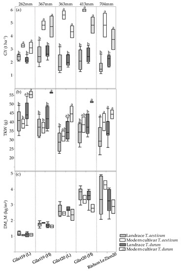 The GY, TKW, and DM_M responses of the four genotypic groups (modern bread wheat, modern durum wheat, bread wheat landraces, and durum landraces) under each of the five environments are presented in Figure 3a–c. A positive GY response to water accessibility is evident in the two groups of modern cultivars (Figure 3a). Landraces’ GY productivity, however, show a different trend, where durum and bread wheat landraces produced 2.4 and 2.1 t ha−1 range across all environments, respectively, with a noticeable response to water availability (Figure 3a). However, there is an exception across all four groups, where the high precipitation at Rishon LeZion20 (704 mm) resulted in a GY reduction, expressed also in TKW reduction (excluding modern bread wheat under the Mediterranean environment) (Figure 3b). This probably occurred due to excess soil moisture during vegetative growth (138.3 and 356.9 mm during December 2019 and January 2020, respectively; Figure A1) that consequently promoted tillering, high biomass production, and lodging (Figure 3c). Similarly, a negative effect of high maximum temperature during the grain filling stage (29.6, 33.7 and 41.4 °C) was recorded in March, April, and May 2020, respectively (Figure A1), which might have also resulted in lower TKW and eventually lower GY (Figure 3b). Notably, the TKW of the modern durum group was significantly higher than that of the durum landraces except for the Rishon LeZion20 growing environment. In contrast, the TKW of modern bread wheat did not differ from bread wheat landraces in any of the environments (Figure 3b). In addition, crop productivity can also be expressed in DM biomass at maturity. As can be observed, all four genotypic groups exhibited a constant increase in DM productivity with increasing water availability (Figure 3c). However, similar to GY, under the Mediterranean environment (Rishon LeZion20) DM_M mean production was slightly lower among the landraces groups (Figure 3c).