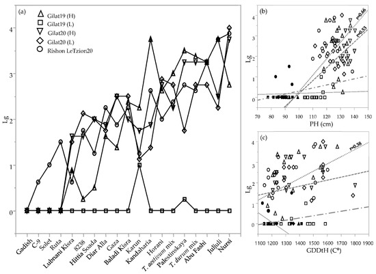 Lodging was rated three times during the crop vegetative and reproductive stages (Table 2). Since the lodging situation worsened as the season progressed for most of the genotypes, we chose the latest scoring date for comparing the genotypes across environments (Figure 4). Lodging severity clearly discriminated between lines that tended to lodge, those that did not lodge, and those that exhibited intermediate lodging in any of the environments. Notably, in the driest environment (Gilat19, 262 mm), none of the genotypes lodged (except Karun, with a lodging score = 1). Some of the genotypes had severe lodging in most of the environments, probably the result of culm length, plant height, and late phenology. Plant height was highly correlated with lodging among durum and bread wheat landraces (r = 0.66 and 0.53, respectively; Figure 4b). Durum landraces’ lodging rate was also significantly correlated with GDDtH (r = 0.38; Figure 3c). In addition, lodging negatively correlated with yield components in durum (TKW; r = −0.7) and bread wheat landraces (HW, r = −0.49; and TKW, r = −0.033; data not shown). Conversely, as expected, the semidwarf modern cultivars of both durum and bread wheat showed lodging resistance in all the environments (except cv. Ruta with a lodging score = 1.5) in Rishon LeZion20 (704 mm) (Figure 4a).